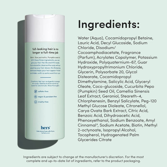 hers triple threat shampoo for hair that feels and looks thicker and stronger with biotin, saw palmetto, pumpkin seed oil, lightly scented with rose, helps control hair shedding,6.4 oz
