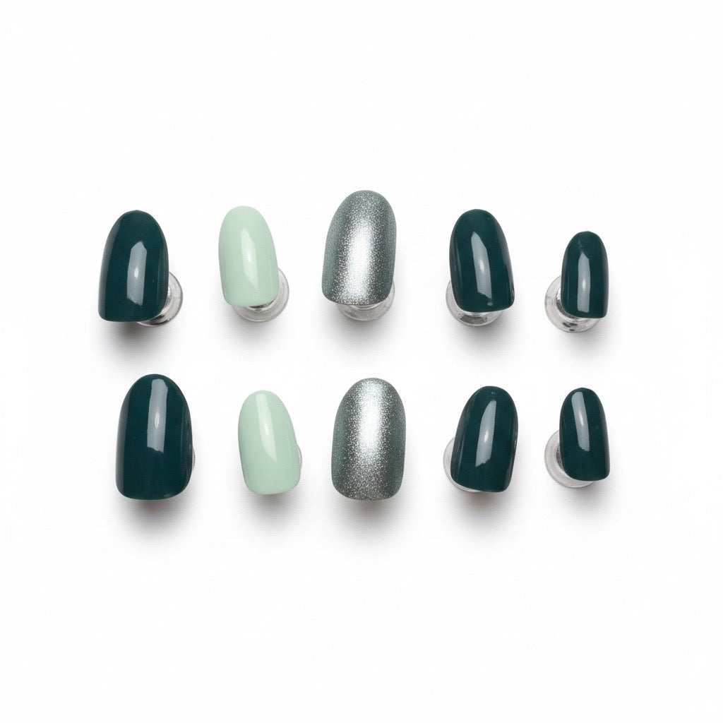 Kay Bei Color Architect Press-On Nails – Emerald Mint + Silver Accent | 10-Piece Short Oval Set