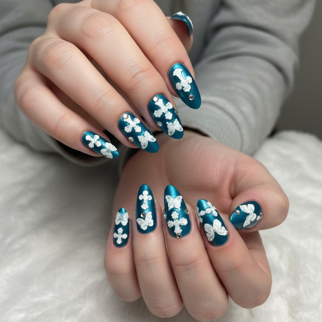 Designed for women who love statement nails with meaning, Sacred Lace blends deep emerald satin with delicate lace crosses and butterflies for a look that feels both bold and feminine. Each nail is hand-finished with precision placement and crystal accents, creating a boutique art set that feels custom-made.